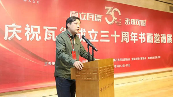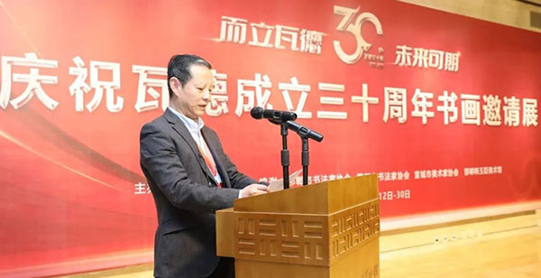 瓦德集團董事長謝富強向與會的各路藝術(shù)家及賓朋表達了熱情歡迎。向河北邯鄲、湖北黃石、安徽宣城三地文聯(lián)、書協(xié)、美協(xié)和書畫家們的大力支持表達了衷心感謝。尤其對中國知名書畫家,邯鄲市書協(xié)主席,文化名人,著名企業(yè)家韓玉臣先生對瓦德集團慶典活動的鼎力支持表達了深深的敬意和由衷地感謝。在三千年歷史的趙國都城邯鄲,能有瓦德集團如此注重文化藝術(shù)的實屬難得,能將深厚的中國文化的脈絡注入到自己的企業(yè)產(chǎn)品中非常難得。