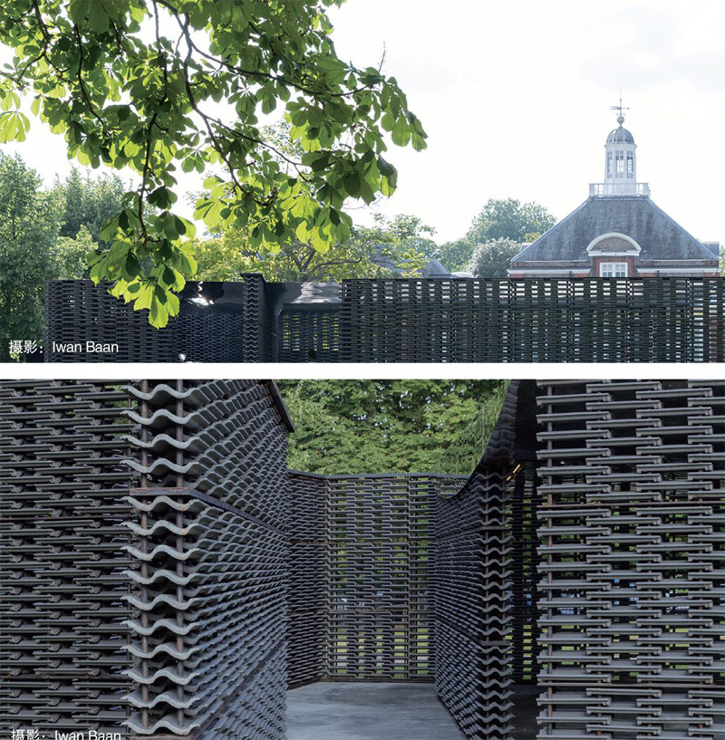 這次她用水泥瓦設(shè)計(jì)的展亭,以兩個(gè)長(zhǎng)方形體量組合成庭院空間,通過運(yùn)用光與水的元素,營(yíng)造出墨西哥民居的感覺,同時(shí)也和倫敦的文化環(huán)境產(chǎn)生聯(lián)系。